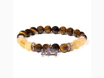 Armband tigeröga & rutilerad kvarts med elefant, 8 mm pärlor