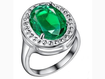 Silver Ring -Stor Oval Grön Kristall & Fint Mönster - Silverpläterad -Stl 17,3