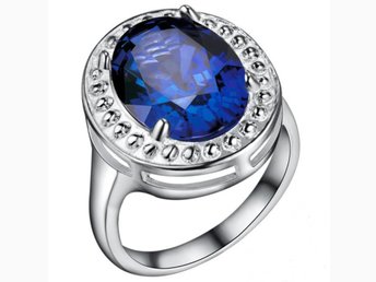 Silver Ring - Stor Oval Blå Kristall & Fint Mönster - Silverpläterad -Stl 16,5