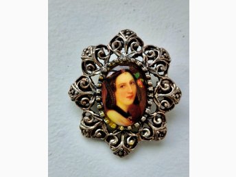 Retrobrosch av genombruten metall med ett porträtt av en dam