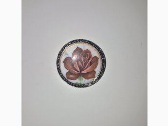 Antik brosch handmålad blomma på porslin förgyllt silver