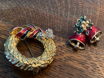 2 Julbrosch: julkrans o klockor i metall. Brosch till advent glögg festen jul