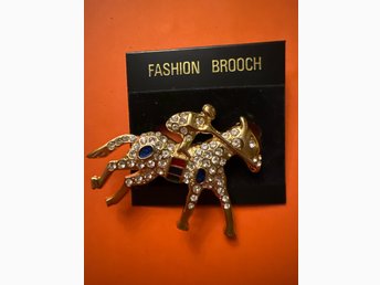 NY / oanvänd! Brosch i form av häst och ryttare i gulmetall / emslj / strass