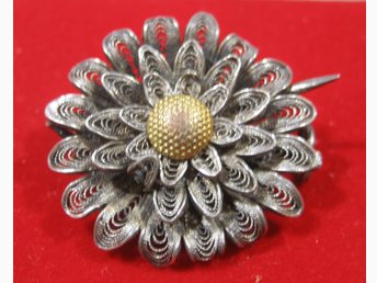 Vintage silverfärgad brosch Rosett i filigran oläslig stämpel