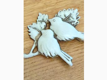 Vintage brosch med två fåglar – vit plast/resin – retro smycke ca 6 cm