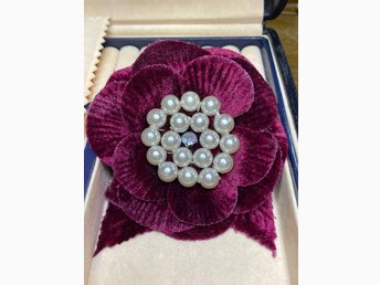 Vintage Stor Blomma Brosch Vinröd sammet med pärlor 50/60 tal