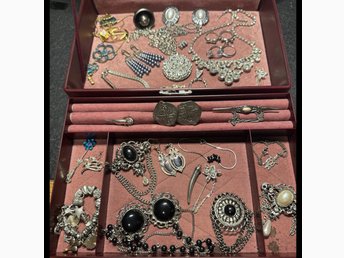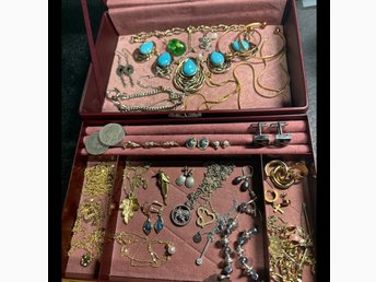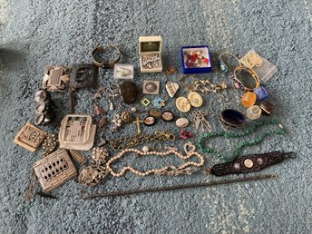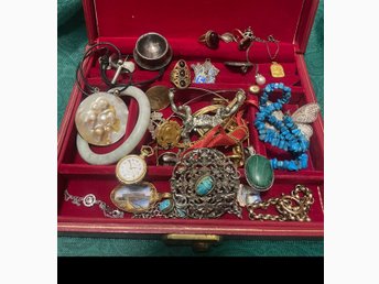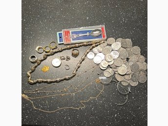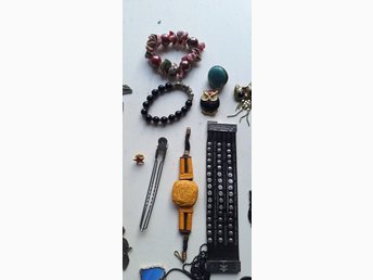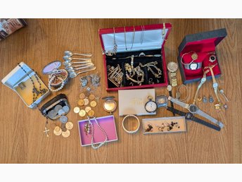 En samling från dödsbo med smycken, klockor, mynt och pins