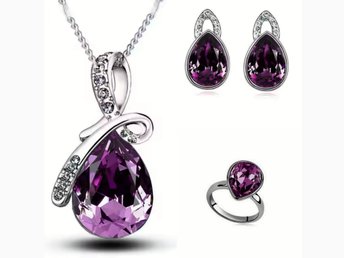 Silver Smyckesset - Halsband, Örhängen & Ring - Mörk Lila Droppe -Silverpläterat