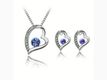 Vit Guld Smyckesset - Halsband & Örhängen - Hjärta & Mörk Blå Kristall - GP