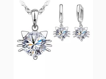 Silver Smyckesset - Halsband & Örhängen - Katt & Vit Kristall - Silverpläterat