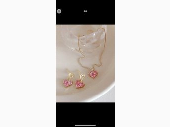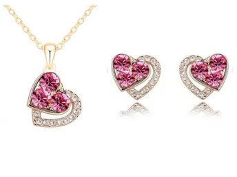 Guld Smyckesset - Halsband & Örhängen - Hjärta med Rosa Kristall - Guldpläterat