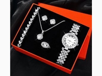 dammklocka, ring, halsband, handband och örhängen med orange låda