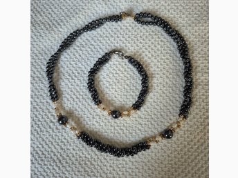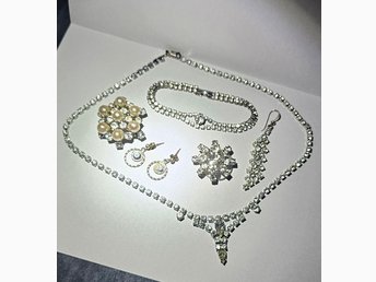 Retro Stenhalsband och armband dubbelradigt med vita pärlor och ståltråd stenar