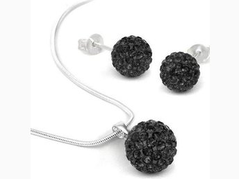 Silver Shamballa Smyckesset - Halsband & Örhängen - Svart Boll - Silverpläterat
