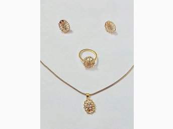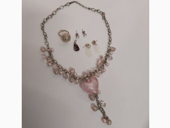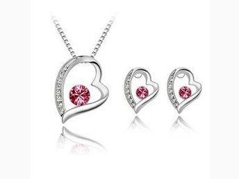Vit Guld Smyckesset - Halsband & Örhängen - Hjärta & Mörk Rosa Kristall - GP