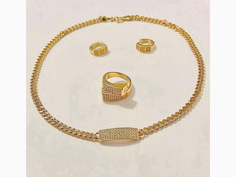 24 k Guld Pläterad Jätte Hög kvalitet Smyckesset med Halsband Örhangen och ring