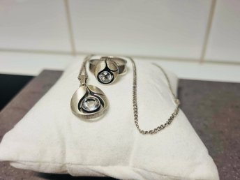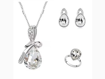 Silver Smyckesset - Halsband, Örhängen & Ring - Vit Droppe - Silverpläterat