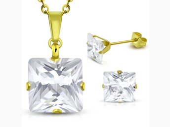 Guld Smyckesset i Stål - Halsband & Örhängen - Fyrkanter & Klara CZ Kristaller
