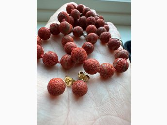 Långt OLE LYNGGAARD. Collier, korall, med dobbar och örhängen korall 18K guld