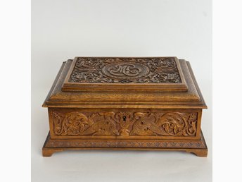 Äldre träskrin intrikata sniderier & monogram klädd, vinrött sammet smyckesskrin