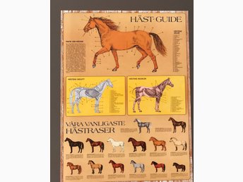 HÄST GUIDE,RETRO SKOLPLANSCH FAKTA OM HÄST ANATOMI MUSKLER SKELETT OCH RAS