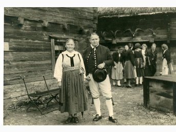litet fotografi av folkdansare i Helsingborg 1930-talet, troligen Fredriksdal