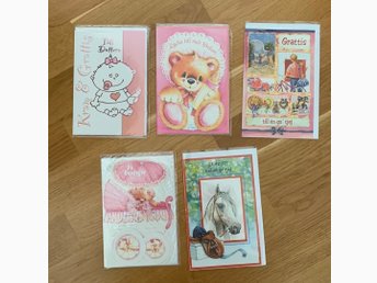 5 Gratulationskort med kuvert flicka baby dop häst tjej