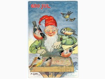 Äldre signerat Vykort "God Jul" med tomte och fåglar