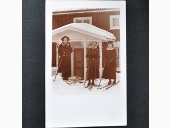 Fotovykort Tre kvinnor på skidor dåtidens kläder och skidutrustning 1916