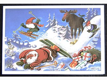 TOMTAR Provar SKIDÅKNING Nytt Julkort av HARRY LANGE B75 ÄLG och HARE