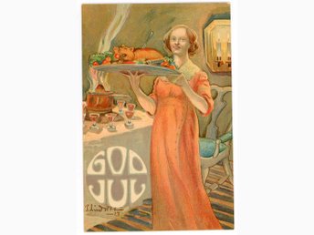 Äldre Signerat Julkort kvinna som bär en bricka med gris på fat 1913