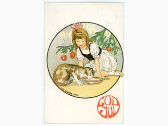 Äldre signerat Maj Lindman Jan, vykort "God Jul" med flicka och katt