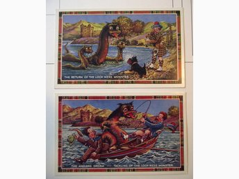 VINTAGE - 2 st äldre tecknade vykort från/om SKOTTLAND/The Loch Ness Monster