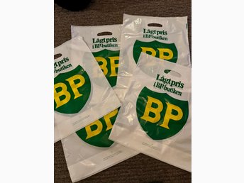 Fem retro plastpåsar från den tidigare bensinstationskedjan BP i Sverige.