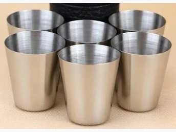 6 st nya oanvända snapsglas i metall i sammetspåse, till jakt, utflykt el. fest
