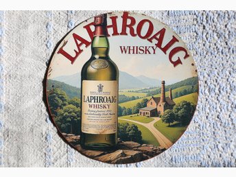 Rund skylt i metall LAPHROAIG whisky destilleri Skottland ca 20 cm diameter