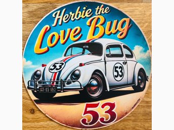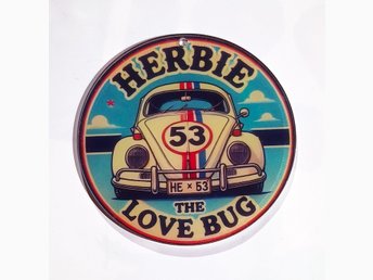 Dekorativ plåtskylt - Herbie the Love Bug ! 20cm diameter. Hål klart från fabrik