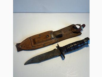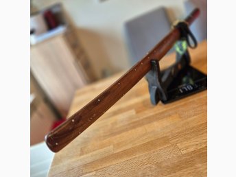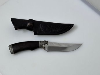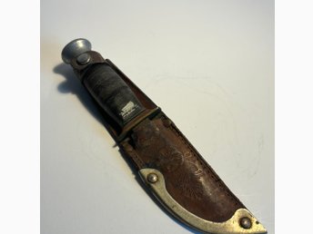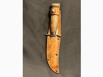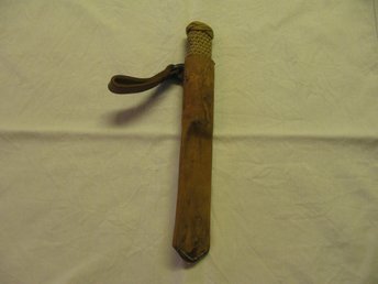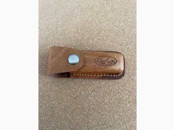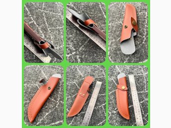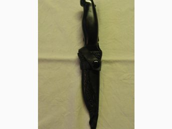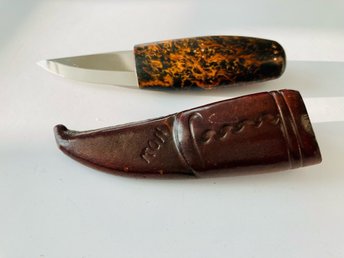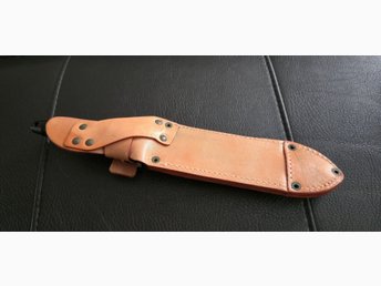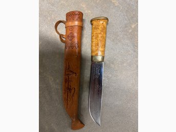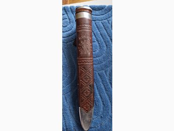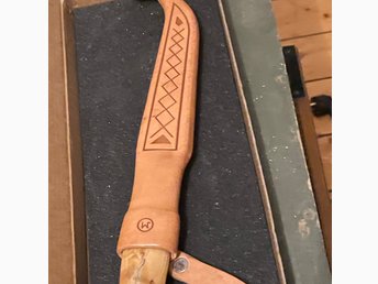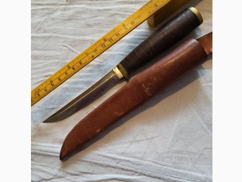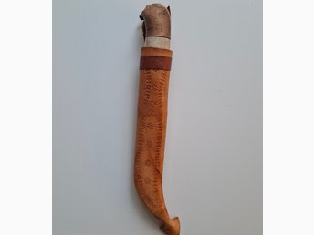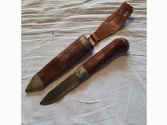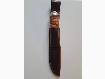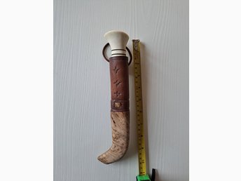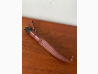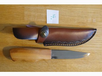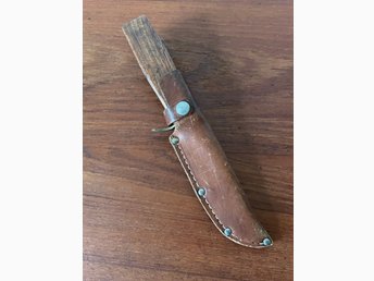 Handgjord kniv med läderskal trähandtag troligen Äpple?
