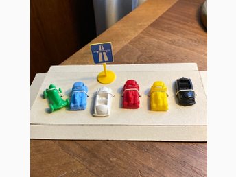 6 småbilar i plast + vägskylt retro