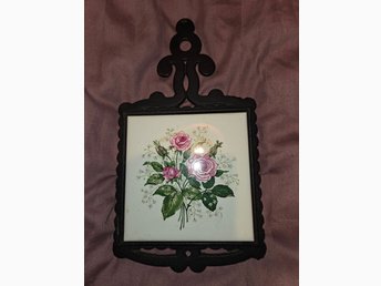 1940 talet grytunderlägg porslin och gjutjärn blom motiv