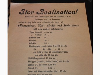 Reklamaffisch för Stor Realisation hos handlare F.O. Nelson i Målilla från 1902