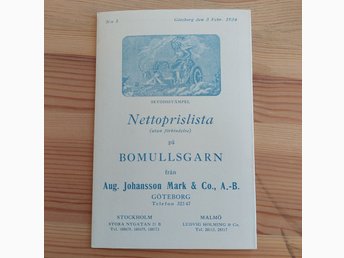 Priskurant Bomullsgarn från Aug. Johansson Mark & Co., A.-B. Göteborg 1934