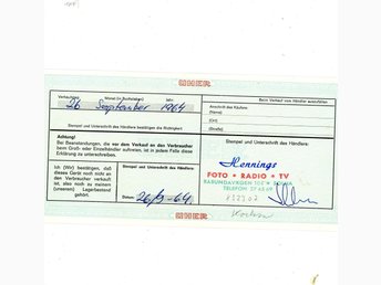 5 dokument inköp radio hos Hennings radio Solna 1964-09-26, Uher tv, försäkring