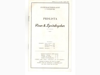 Systemaktiebolaget Västervik Prislista Viner & Spritdrycker april 1954 Vimmerby