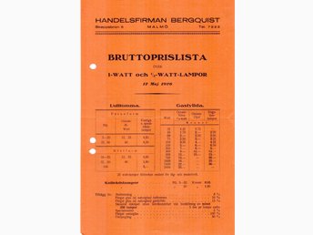 Bruttoprislista reklam från Handelsfirman Bergquist Malmö 12 maj 1926 Belysning