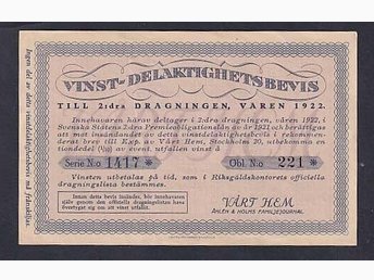 Delaktighetsbevis i Premieobligationslån våren 1922.