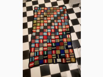 Färgglad stickad pläd, antagligen en bilfilt. Annorlunda mormorsrutor