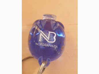 Nordbanken 90tal Nyckelring gris spargris 915 blå Poul Willumsen PR Danmar