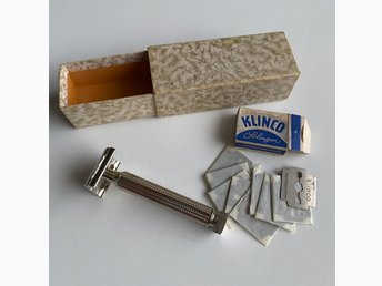 Vintage Mustasch-Rakhyvel Klinco från 1940-talet med originalkartong och rakblad