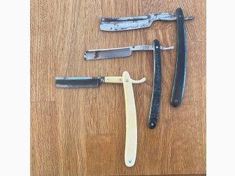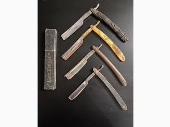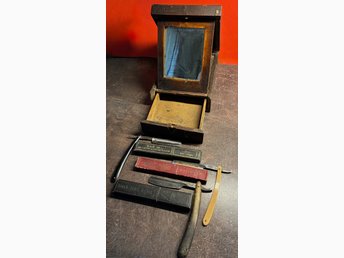 Mycket gammal rakspegel & 3 rakknivar. Solingen & Thomas Turner samt fodral